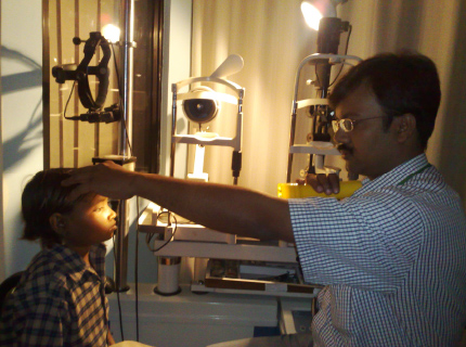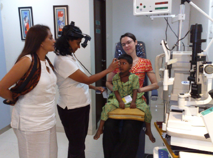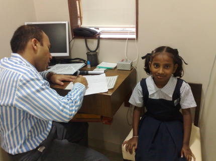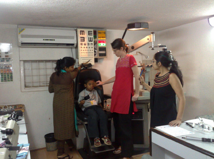 Out of the 2640 children vision screened by the H. R. College students under the ‘Train the Trainers’ program by the Foundation, almost 20% were transported to clinics and hospitals in south Mumbai. This picture illustrates Dr. Deepak Garg (Paediatric Opthamologist) examining a child with a squint at his hospital ‘Eye Solutions’, Kemp’s Corner, Mumbai.
