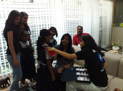 A total of 2640 children were screened at four schools in south Mumbai. This picture illustrates Isha Dave (Optometrist) undertaking vision screening on the children.
