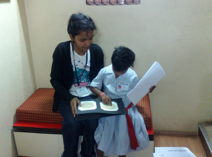 H.R. College student Olivia with a child from Seva Sadan at Jyoti Dave-Singh’s clinic to help out with further screening.