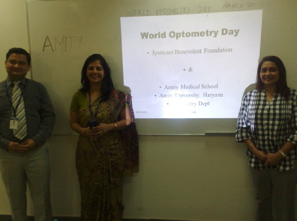 JCBF Trustee Jyoti Dave-Singh gave free lectures at Optometry institutions as part of World Optometry week at Amity Medical College, Amity University, Haryana.