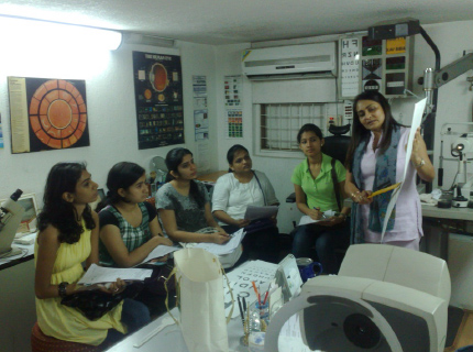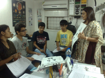 Trustee Jyoti Dave-Singh teaching HR College Mumbai students how to do ‘Basic vision screening’ at her clinic.