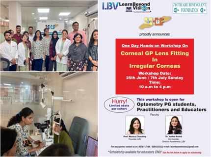 JCBF sponsored 10 faculty members, 6 optometrists and PG students for the workshop on 'RGP Lens Basics & Advance fitting of Irregular Corneas’ conducted by Learn Beyond Vision (LBV) on 7th July 2023 and 6th August 2023 held at MCVI, Gurgoan