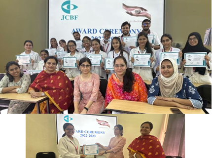 JCBF organised an Award distribution ceremony of Lotus college Interns on 25th may 2023 for screening of 1420 children and teachers of 4 schools. Prizes for the best quality Vision Screening & full examination at Hospital were awarded